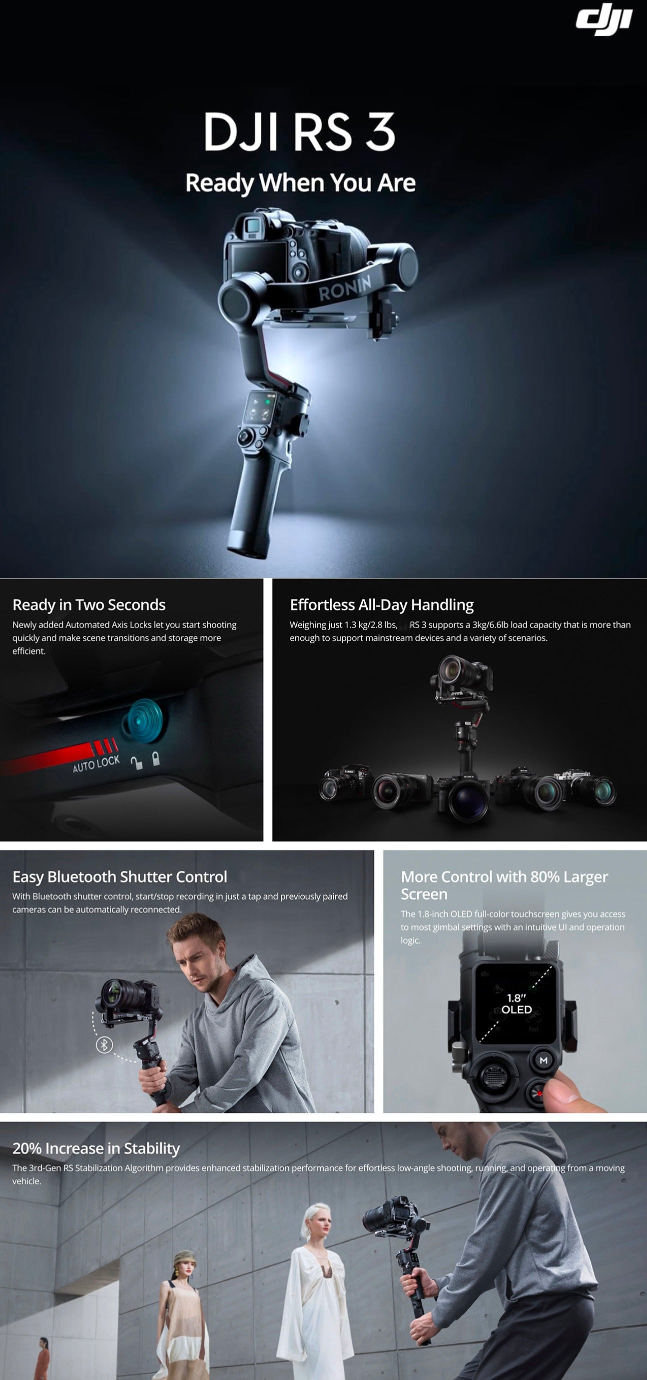 - Automated Axis Locks: The RS3 features automated axis locks that unlock and expand the gimbal when powered on, and lock when powered off, allowing for quick setup and efficient transitions between shots.